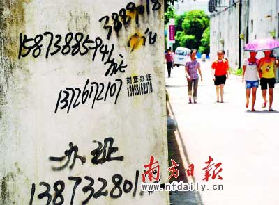 根據(jù)讀者提供的線索,6月8日,記者來到沙溪寶珠東路。在該路段上的一些店鋪、墻體及電線桿上都貼滿了各色辦證電話,有些電話甚至被用黑體大字直接寫在墻上。記者沿路走了不到100米就看到有27個不同的辦證電話。