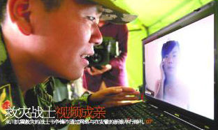 在布置婚禮現(xiàn)場時,謝正義想到了比電話婚禮更好的辦法:進(jìn)行網(wǎng)絡(luò)視頻連線,讓韋爭鋒兩口子彼此都能看得見對方,那多好!正好他帶來了手提電腦,有無線網(wǎng)卡,趕緊連上試試?蛇z憾的是,無線網(wǎng)卡的速度太慢,視頻畫面非常不流暢。正當(dāng)大家愁眉不展時,都江堰外國語實驗學(xué)校的副校長羅位全帶著滿箱的餅干、水、喜糖等前來賀喜,羅校長立馬從已搭建好的校舍板房內(nèi),拉出一根200多米長的電話線,將電腦通過電話上網(wǎng),這下網(wǎng)速快了,試了試,視頻效果還真不錯。但由于沒有音響,只能保證視頻;要聽到聲音,還得通過電話對接。這根電話線在泥濘的板房搭建地彎彎曲曲地拉出來,一些戰(zhàn)士樂呵呵地說:“還真是千里姻緣一線牽呀。”