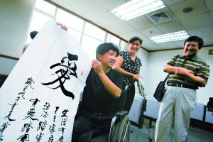 記者了解到,吳華林?jǐn)嗤惹霸诒本⿵氖路b生意。斷腿后,他無(wú)法再?gòu)氖氯魏喂ぷ鳎谑情_始用練字來(lái)打發(fā)時(shí)間!拔乙郧皬臎](méi)練過(guò)毛筆字,這兩年才開始練,你看,這是我寫的‘愛(ài)’字!眳侨A林邊說(shuō),邊從放在輪椅上的包內(nèi)拿出一幅字讓記者看。目前,吳華林在北京街頭以賣字為生,每幅字讓購(gòu)買者隨意出錢,“有的給5塊錢,有的給10塊或20塊”。聽(tīng)完終審判決后,他還專門把寫有“謝謝”的一幅字送給法官。