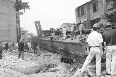 記者看到,這段鐵路橋呈南北走向,向北放眼望去,20多米高的鐵路高架橋像巨龍一樣延伸開去。往南看,僅剩200多米的橋面尚未鋪好!岸伎焱旯ち,誰知道還會出這事!苯衲晁氖鄽q的老龍租住的房子在鐵路的東側(cè),距離倒塌下來的模架最近只有十幾米,中間隔著一條三米多寬的小路。前天上午9點多,老龍從雙嶼鎮(zhèn)農(nóng)貿(mào)市場賣完菜剛走進二樓的房間,就聽見一陣“嘩啦啦”的巨響,腳下的地板也在顫抖。“地震了!”老龍沒有多想,轉(zhuǎn)身奔到樓下,才發(fā)現(xiàn)原本掛在鐵路橋上近50米長的移動模架不見了,橋墩兩側(cè)的房屋被地上騰起的煙塵全部遮住,只有橋墩的頂部還露出了一小段。煙塵持續(xù)了20分鐘才逐漸消散。“如果事故提前一個小時,死的人會更多!睋(jù)老龍介紹,發(fā)生事故的那個路段是交通要道,鐵路東側(cè)的居民買菜,都要穿過鐵路橋,到橋西側(cè)的雙嶼鎮(zhèn)農(nóng)貿(mào)市場。上午8點左右,正是居民買菜和上班的高峰期!捌匠N覀円渤3南旅娲┻^,只是擔心上面會掉下些小石頭或者水泥塊,沒有想到這下全掉下來了!绷硪晃痪用窀嬖V記者。