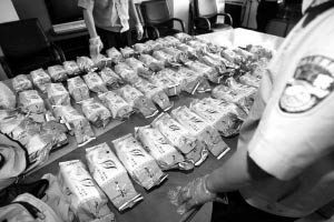 “天盾”行動(dòng)中繳獲的用茶葉包裝袋裝好的毒品。
