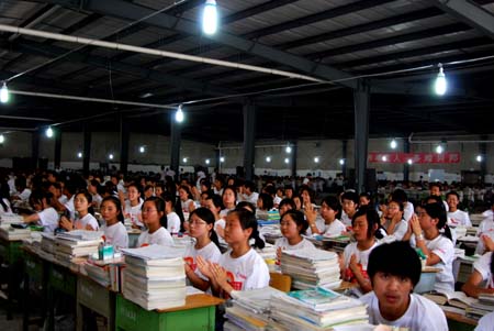 據(jù)介紹,在這間面積足可以挑戰(zhàn)世界紀(jì)錄的“教室”里,災(zāi)區(qū)的學(xué)子們在老師的引導(dǎo)下,正全力向自己的目標(biāo)沖刺。這間“巨型教室”里面非常涼爽、整潔,桌面上堆著像小山一樣的復(fù)習(xí)資料。在這些復(fù)習(xí)資料邊上,是一大束潔白的梔子花。孩子們都喜歡梔子花,他們說:“梔子花的香味能讓我們很放松!边@間堪稱中國乃至世界最大的教室,長110米,寬80米,擁有8800平方米的面積。這本是當(dāng)?shù)匾患抑扑幑緞倓偮涑傻亩趶S房,還沒有裝修,但用來做學(xué)校的教室、宿舍,卻出人意料。