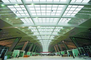 今天早晨記者探訪新北京南站,發(fā)現(xiàn)新建筑大氣、壯觀的現(xiàn)代化風(fēng)格已經(jīng)整體顯現(xiàn)。與傳統(tǒng)火車站方方正正、候車空間封閉的形象迥然不同,相比之下,新南站建筑更像機(jī)場航站樓;視野通透、裝飾風(fēng)格簡潔明快。9米高的高架候車大廳白天不需要燈光照明,陽光透過屋頂采光帶傾瀉下來。