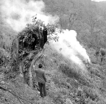 從西雙版納景洪市往景訥鄉(xiāng)走,一路上看到的全是光禿禿的山頭,樹木橫七豎八地倒在一旁,還冒著滾滾濃煙!敖鼛啄暌驗橄鹉z價格飛漲,整個西雙版納開始大規(guī)模毀林種膠。樹木砍倒后運不出去,就只有放火燒掉,同時還能做橡膠林肥料,我們這里又回到了‘刀耕火種’的原始社會了!笨蛙囁緳C說。