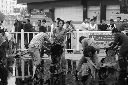 吊車作業(yè)的過程中,就有部分人準備好簸箕、臉盆等工具,要搶泄漏在地面上的原油。7時許,見仍沒有專門的清理人員前來清理路面上的原油,部分人開始哄搶原油,他們先是五六個人一組站成一圈,圈定自己的地盤,接著用衣服、簸箕、臉盆等工具收集路面上的原油,然后迅速裝入編織袋內(nèi)。
