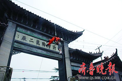 就在此時,消防員飛身撲了上去,將該女子抱住。由于這名女子拼命掙扎,二人雙雙從門樓上掉了下來,幸虧消防員身上的繩子才使兩人懸在半空中。