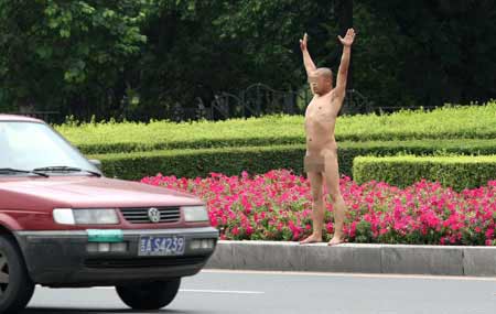 “瘋了!我瘋了!”7月2日15時(shí)40分,一男子在長(zhǎng)春市人民廣場(chǎng)上擺起了“裸男”的造型,嘴里還不停地嘀咕自己瘋了,引來(lái)了眾多圍觀者,造成該路段的交通一時(shí)堵塞。