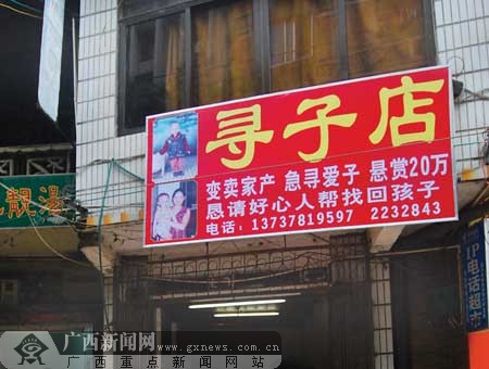 湖北人彭高峰苦苦尋子無果,在深圳開起懸賞“尋子店”。7月4日,記者在藤縣街頭也看到一個(gè)類似的“尋子店”,店主黃佩云告訴記者,她兒子莫鴻濤失蹤近5個(gè)月,警方至今沒有立案。她在網(wǎng)上看到彭高峰的事情后,無奈之下也效仿他在街頭開起“尋子店”,懸賞20萬元尋子。