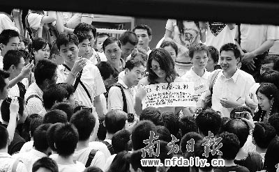 昨日(7月8號(hào))下午2時(shí)許,一身著粉紅色衣服、戴太陽鏡、穿黑色網(wǎng)狀絲襪的摩登女郎現(xiàn)身深圳福田區(qū)華強(qiáng)北曼哈購(gòu)物廣場(chǎng)前,脫掉上衣,只留下黑色內(nèi)衣,手舉“徐滇慶再道歉,因賭房?jī)r(jià)教授徐滇慶僅在某報(bào)刊登半版道歉廣告引起部分市民不滿,身為徐老粉絲,本人獻(xiàn)玉體做版,為其追補(bǔ)道歉,以求對(duì)其諒解!”的牌子引來眾多路人圍觀、議論。