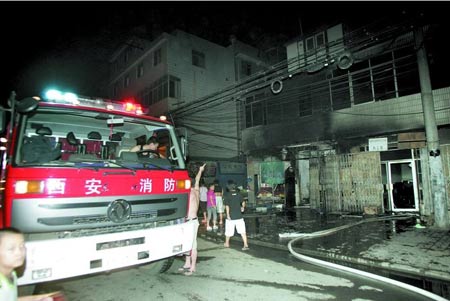 昨晚10時許,西安市邊東街瑾臻網(wǎng)吧突然燃起大火,大約二十分鐘后,趕到現(xiàn)場的消防官兵將火撲滅,但網(wǎng)吧外面已經(jīng)燒得漆黑,整個二層小樓已經(jīng)面目全非!熬W(wǎng)吧在一樓,二樓沒有住人。”網(wǎng)吧收銀員侯先生告訴民警,當時網(wǎng)吧內(nèi)共有54個人在上網(wǎng),網(wǎng)吧的南門被潑進了汽油,上網(wǎng)者都從北門逃離,沒有造成人員傷亡。