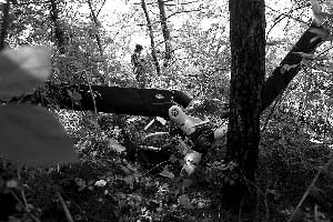 昨日,直升機(jī)殘骸在金海湖林區(qū)的山坡上,螺旋槳和機(jī)身已經(jīng)分離。