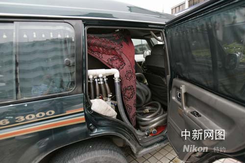 記者今日在佛山市張槎派出所內看到,“油耗子”將吉普車改裝成的油罐車內“裝備”齊全,車輛側窗和尾窗玻璃用布簾遮得嚴嚴實實,根本看不到車內的情形。