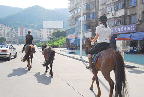 連日來的傍晚時(shí)分,只要天氣晴好,(浙江)諸暨最繁華的街區(qū)就會(huì)出現(xiàn)這樣一副場景:兩三名時(shí)尚男女,身穿騎師服裝,騎著高頭大馬,旁若無人地在車流中穿行。途經(jīng)之處,總引得好奇市民拿起手機(jī)、相機(jī)一通抓拍。