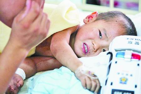 昨日上午10時(shí)20分,在鄭州市兒童醫(yī)院住院部外一科病房,記者見(jiàn)到了這個(gè)正在側(cè)身熟睡的男孩邢錦祥。此時(shí),小錦祥正在輸液,他的右臂、后背等部位有傷,包著紗布。