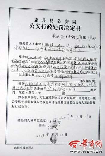 在志丹縣公安局公安行政處罰決定書上寫著:七月十一日凌晨兩時許,我所巡邏車走到紅都街飄香燒烤店門口時,見張靖辱罵防暴大隊民警。我所民警便將張靖帶回派出所醒酒,張靖在派出所院內用拳頭將我所民警打了一拳,又在值班室大吵大鬧并辱罵值班室民警及其他候問室人員。根據《中華人民共和國治安管理處罰法》第二十六條第四款之規(guī)定,決定給予行政拘留十五日的處罰。