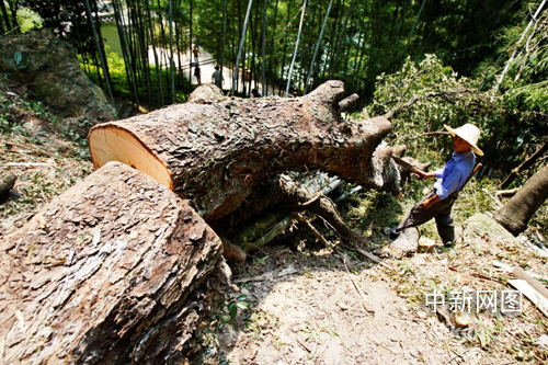 中新網(wǎng)杭州7月29日電(記者 龔讀法 實習生 徐珍)日前,浙江省杭州市千島湖遭遇了一場強暴風雨,其間還夾雜著龍卷風。暴風雨過后,在千島湖中心湖區(qū)龍山島上,幾名工人發(fā)現(xiàn)了一顆被暴風連根“拔”起的古樹。該樹種名為“化香樹”,從樹輪圈數(shù)上來看,年齡有一二百年以上。這顆古樹需要兩到三各大人才能合抱的起來,而且木質(zhì)堅硬、生長速度緩慢,但古樹還是不敵暴風風力,轟然倒下。