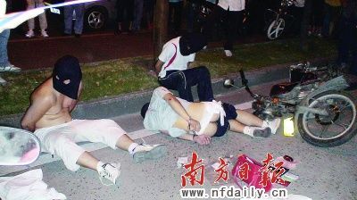 當(dāng)晚,記者趕到現(xiàn)場(chǎng)看到,其中一名搶匪側(cè)躺在地上,屁股部位稍稍露出,醫(yī)院護(hù)士已對(duì)他的傷口進(jìn)行了包扎。醫(yī)生表示,已為搶匪做了臨時(shí)包扎,目前其沒有生命危險(xiǎn)。另外兩名搶匪則坐在地上,現(xiàn)場(chǎng)還有一輛翻倒的摩托車和一個(gè)女式手提袋。