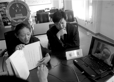 法官通過攝像頭向遠(yuǎn)在美國的焦老漢展示材料。 本報記者王儉攝
