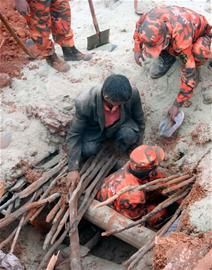 求救的男子撲通一聲跪倒在地,淚水瞬間打濕了面頰;協(xié)助救援的村民們也都紛紛捂著臉,退向外圍;文偉、薛紅兵、鐘銀和劉小威低下頭,悄悄抹去眼淚,“干了這么多年救援,就從沒見過這樣的場面。”為了不傷害母女倆的遺體,4個(gè)人把鋤頭、鐵鍬等全部扔了出去,改為徒手挖掘,“每一秒鐘,我都有一種想跪倒的感覺,我們所面對的,已不是她們的遺體,而是偉大的母愛!