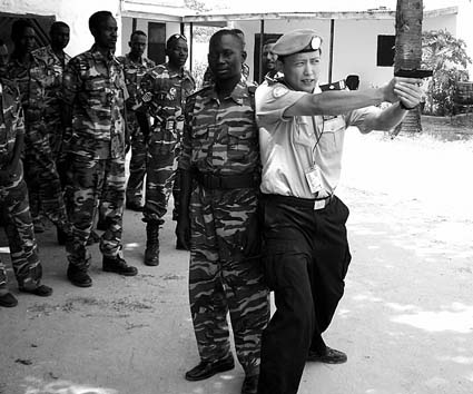 張良告訴記者,在與當(dāng)?shù)鼐旌彤?dāng)?shù)厝私佑|中發(fā)現(xiàn),他們喜愛(ài)中國(guó)功夫,中國(guó)武打電影明星他們都非常熟悉,經(jīng)常有人向他請(qǐng)教中國(guó)功夫。“非洲人體質(zhì)非常好,剛開始一些新警學(xué)員看到我,總想與我切磋一下。在試過(guò)幾次‘貼身摔’之后,他們對(duì)中國(guó)功夫心服口服!睆埩夹χf(shuō)。在教授防衛(wèi)術(shù)之余,很多當(dāng)?shù)嘏笥讯祭p著他傳授幾招中國(guó)功夫,但往往一個(gè)在中國(guó)常見(jiàn)的“倒功”就讓他們驚訝半天。中國(guó)功夫拉近了張良與當(dāng)?shù)鼐斓木嚯x。