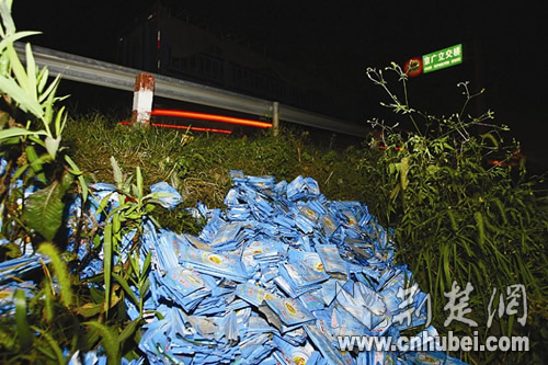 昨晚9時(shí)許,記者趕到現(xiàn)場(chǎng)看到,京廣立交橋離孝感主城區(qū)約1公里左右,是107國(guó)道與京廣線的交會(huì)處,奶粉袋位于107國(guó)道橋頭的雜草叢中,每5個(gè)空袋用橡皮筋捆為一扎。記者隨手翻開(kāi)了兩扎,發(fā)現(xiàn)奶粉袋上灰塵不多,袋口均有撕開(kāi)的痕跡,上面標(biāo)注的生產(chǎn)日期從2006年3月到9月不等,保質(zhì)期為18個(gè)月。