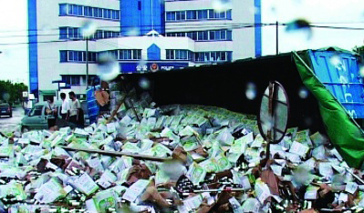 “黑格比”肆虐,載滿啤酒的大貨車被掀翻在地。資料圖片