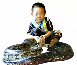 大多數(shù)小朋友看到冷冰冰、滑溜溜的蛇都會嚇得趕緊躲開,可8歲的秉哲卻與一條重69公斤的巨蟒成了莫逆之交。秉哲與父親帶著蟒蛇來到了東莞常平隱賢山莊,要在國慶期間表演“人蛇情深”。秉哲的父親告訴記者,秉哲9個(gè)月大時(shí),就跟蟒蛇在一起玩。他夏天貪戀蟒蛇冷冷的體溫,把蟒蛇當(dāng)枕頭睡覺,冬天擔(dān)心蟒蛇受凍,則為“好朋友”鋪毛毯。