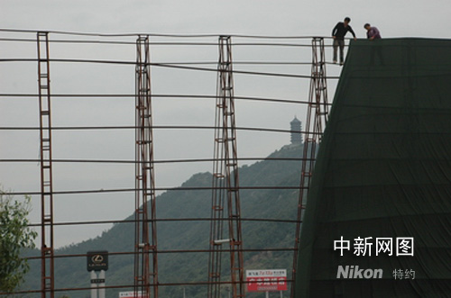 工人在浙江臺(tái)州一國(guó)慶車(chē)展現(xiàn)場(chǎng)加固施工,以應(yīng)對(duì)超強(qiáng)臺(tái)風(fēng)“薔薇”的到來(lái)。作者:陳林聰