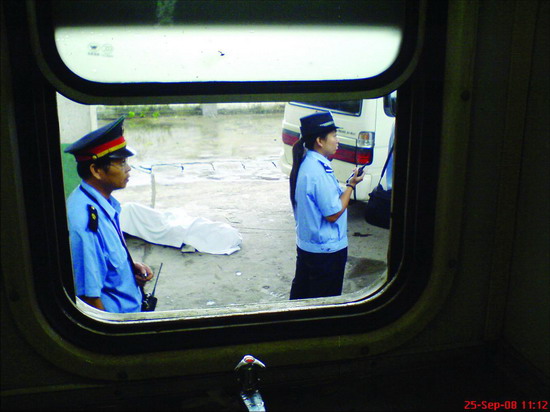 圖:黃先生在車廂里用手機(jī)拍下尸體被卸在車站上。