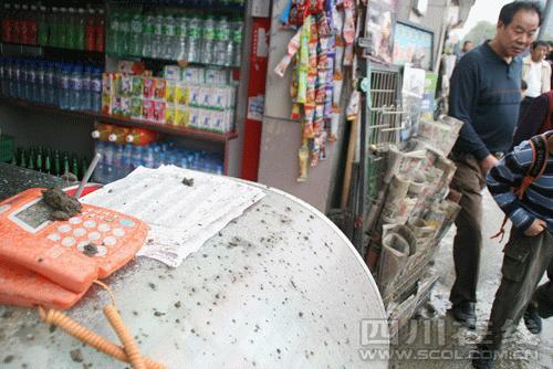 干雜店老板張敏不斷地從屋里掃出泥水。據(jù)她說,下午3點20分左右,她正在店里清理商品,忽然聽到“砰”的一聲巨響,然后就聽到“轟轟”的聲音,緊接著飄來濃濃的刺鼻氣味。張敏忙往外一看,離店鋪僅兩米印有“成都排水”字樣的綠色施工防護墻不斷晃動,沙石隨著黑色的煙霧直沖進屋子,“我以為又地震了!睆埫翥读俗阕阋环侄噻,才想起來要往外跑。跑到門口時,她看到整條街上一個行人都沒有了,其他店鋪的商家已往安全地帶跑去,慌亂之際,她來不及拉上卷簾門便直接往一環(huán)路方向跑去。