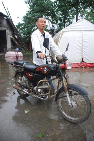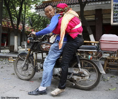 妻子雖在地震中去世,但丈夫為了還妻子一個尊嚴,毅然將妻子綁在身上,用摩托車載回了家。這幅地震后瞬間抓拍的照片,曾感動了萬千網(wǎng)友。昨日,建川博物館副館長何新勇趕到綿竹市新龍鎮(zhèn)廣平村,從吳家方手中接過了他搭載遇難妻子遺體的摩托車。