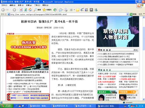 同時(shí),在國內(nèi)多家網(wǎng)站社區(qū)和論壇內(nèi)也出現(xiàn)一則標(biāo)題為《桂林全州10天驚現(xiàn)五具少女裸尸》的網(wǎng)絡(luò)貼子。一時(shí)間,這條消息在網(wǎng)絡(luò)瘋傳開來!