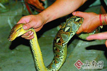 前日凌晨5點(diǎn),接到景洪市畫家楊洪榮的熱線電話,記者從睡夢中躍起,驅(qū)車趕到位于版納氣象局住宿區(qū)內(nèi)的一間民宅。只見其二樓陽臺上燈火通明,7名男女的身影正在樓上緊張地晃來晃去,原來,楊洪榮的家中發(fā)現(xiàn)了一條手臂粗的蟒蛇,幾人正在與蟒蛇進(jìn)行著激烈的搏斗。