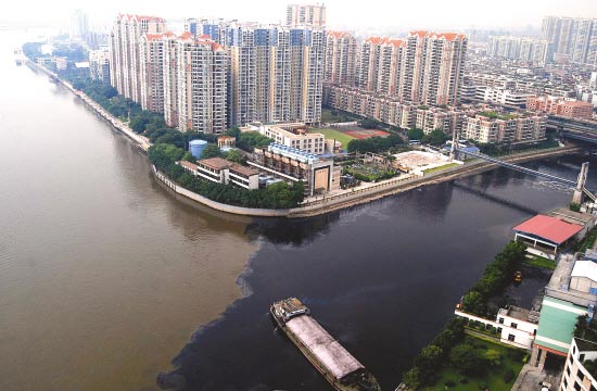 在珠江荔港南灣段,濃黑廢水把半邊珠江染成黑色 朱文海 吳進 攝