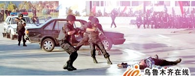 高速公路上,一輛黑色轎車突然沖過交警卡點(diǎn),警笛響起,頭戴鋼盔、手持微型沖鋒槍的特勤民警快速出擊,嫌疑人向民警開槍時被“擊斃”……10月21日,新疆高等級公路交警支隊(duì)進(jìn)行了建隊(duì)十年來,規(guī)模最大的一次快速應(yīng)對高速路突發(fā)事件演習(xí)。