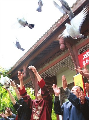近日,峨眉僧門(mén)掌門(mén)人廣邀天下武林高手,參加11月1日的達(dá)摩盛會(huì)。昨日他鄭重地將寫(xiě)好的英雄帖綁在120只鴿子的右腿上,隨后,這些鴿子從望江公園內(nèi)振翅起飛。