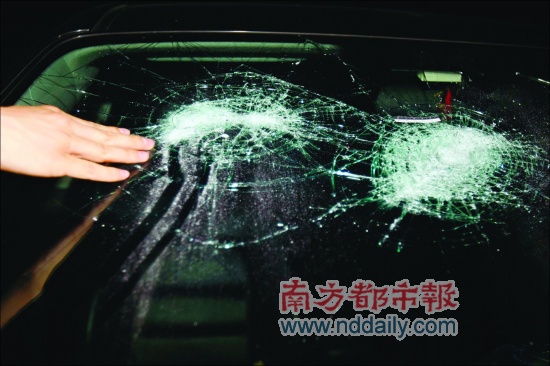 事發(fā)梅林一村84棟北側(cè)停車場(chǎng)。記者昨天下午6時(shí)左右趕到現(xiàn)場(chǎng)看到,被砸爛的是一輛黑色馬自達(dá)6轎車,該車的前擋風(fēng)玻璃有兩處拳頭大小的被砸痕跡,右前車窗整塊玻璃中間有一個(gè)被鈍器擊打造成的大口子。