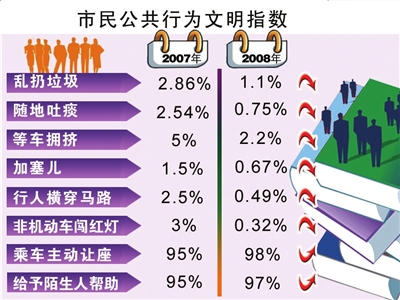 調查顯示,2008年北京奧運會期間,北京市“市民公共行為文明指數(shù)”為82.68,比去年提高了9.3個分值。