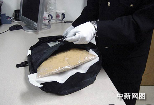 旅檢現(xiàn)場關(guān)員從雙肩背包的夾層里發(fā)現(xiàn)了1253克的毒品海洛因。