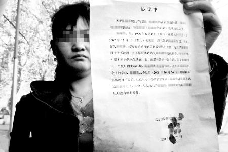 因?yàn)檫@份協(xié)議不合法,鄭州市公證處不予公證。為了讓協(xié)議具有效力,劉紅和王麗在簽字上面按上指印。按上指印后,王麗突然咬著嘴唇,淚珠大顆大顆掉了下來(lái)。她匆匆在一張協(xié)議上按了指印后,死活也不愿在另外兩張上面按了,并開始大罵她的丈夫王濤。門外圍了一圈鄰居。大家七嘴八舌勸道:“何必這樣呢,兩家人商量個(gè)辦法,一塊來(lái)照顧孩子。不管怎樣,要為孩子想想!蓖鯘哑渌送晖馔疲骸皼](méi)事沒(méi)事,放心吧,她現(xiàn)在不按,回頭我會(huì)勸她!