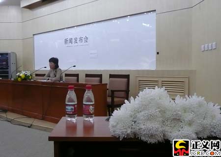 新聞發(fā)布會(huì)現(xiàn)場(chǎng)擺放著寄托哀思的白菊花