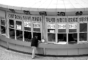 就免費問詢臺里有人拉“黑客”的情況,北京西站管委會工作人員稱,該免費問詢臺設立于2年前,其初衷是給旅客提供旅游信息,如今已承包給了個人,只是“免費問詢臺”這個牌子沒有摘,容易有誤導作用。