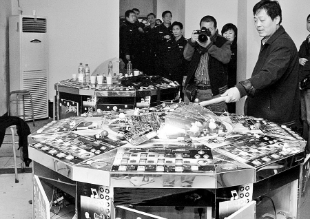 下午3時(shí)20分,記者隨民警來到經(jīng)二路一家沒有任何店名的門面房前。這個(gè)賭博窩點(diǎn)已聞?dòng)嶊P(guān)上了防盜門,記者注意到,門外還張貼著招聘服務(wù)員的啟事。民警強(qiáng)行將門打開,只見50多平方米的屋內(nèi)已空無一人,里面擺著30多臺(tái)“動(dòng)物樂園”等3種賭博機(jī)。門口一中年婦女告訴記者,這家賭博廳開業(yè)已有一個(gè)月了,“他們害人害己,早該取締了!