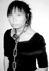 不一會兒,孫曉健帶來一個女孩,只見女孩的脖子上套著一根鐵鏈子,她雙手抱著鐵鏈,渾身發(fā)抖,兩眼含淚,一言不發(fā)。