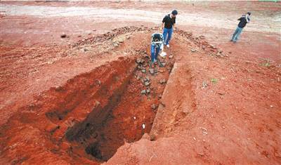 從山坡上可以看到出土漢代耳珰的平臺(tái)已經(jīng)被挖空了一大塊。據(jù)唐濤介紹:“6月初他們剛剛開工不久,我們(郴州市文物管理處)6月4日就在這塊被挖空的平臺(tái)發(fā)現(xiàn)了一座漢代磚室墓,當(dāng)時(shí)下達(dá)了‘停工通知書’,告知建設(shè)方,需經(jīng)我們對墓葬發(fā)掘后才能再動(dòng)工!钡且患埼臅缡链蠛,郴州市文物管理處沒有接到建設(shè)方的任何回復(fù)。