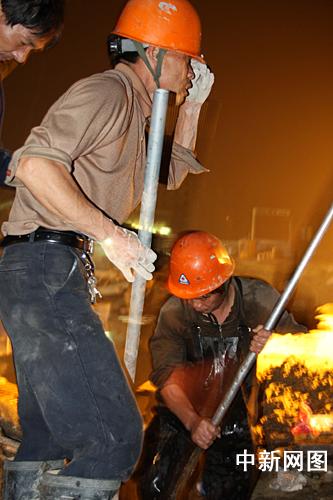 熟悉現(xiàn)場(chǎng)情況的工人正在尋找可能存活的工友。作者:張兆嶺