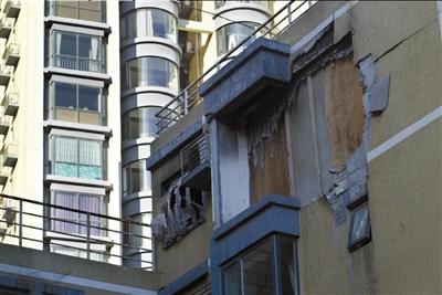 去年8月19日星期天,上午8點(diǎn)40分左右,三環(huán)新城小區(qū)居民安先生和妻子正在去早市的路上。當(dāng)他們經(jīng)過7號(hào)院6號(hào)樓時(shí),頭上突然傳來一聲巨響,他下意識(shí)地拉著妻子往前跑。幾秒鐘后,路面已被碎玻璃和墻皮磚塊等覆蓋,還有一個(gè)沙發(fā)從天而降橫在路上。