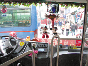 昨天,記者在大學(xué)城看到了這輛動漫公交車,車頭的擋風(fēng)玻璃四邊被鑲上了紅花綠葉的塑料花邊,兩只情侶米老鼠固定在了玻璃中央,一只心形的刺繡香包懸掛在了倒視鏡上。法拉利貼紙、悠嘻猴、長江七號、superman等玩偶也被安放在車頭不同的位置。