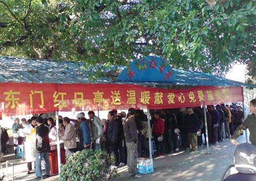 這位網(wǎng)友說,當(dāng)他看到一些明顯是拾荒者和清苦的外來民工模樣的人端著冒著熱氣的粥蹲坐在四周吃的時(shí)候,被感動(dòng)了。