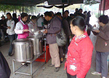 帖子稱:“‘施粥攤’的全名叫‘紅日亭施粥攤’,那里正排著一條長龍,許多從衣著、年齡和氣質(zhì)上就能看出并不富裕的民眾正安靜地排隊(duì)領(lǐng)受免費(fèi)的大米粥。亭子其實(shí)是一頂帳篷,里面有一些桌椅,可供年老體弱的人坐著吃,更多的人坐在外面。那里正好有幾棵大樹,也成了吃免費(fèi)粥的人休息的地方。每個(gè)領(lǐng)受大米粥的人都可以拿到一副同樣免費(fèi)提供的碗筷,為了衛(wèi)生的考慮,碗用可以盛食物的塑料袋包裹。在亭子的一角,甚至還有免費(fèi)的小菜提供;種類有醬瓜、黃豆、榨菜等等,用一個(gè)個(gè)小碟子盛著,供人自由取用。在那亭子的一側(cè),有一個(gè)‘捐獻(xiàn)名單’,表明是一些有善心的民眾自發(fā)組織起來的愛心點(diǎn)……”